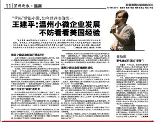 “美国苹果、微软等最早也是小微企业。小企业创新能力强,美国有70%以上的创新发明是在小企业实现的。”前天晚上,在市委政研室、市决策咨询办公室、温州网联合举办的温州民间智库问智会“小微企业的生存与发展”论坛上,伟德BETVlCTOR1946学术带头人王建平先生作了主题讲演,指出美国小微企业的管理经验对温州经济发展有一定的参考价值,观点犀利、令人深思。□本报记者 朱承立 通讯员 王长明