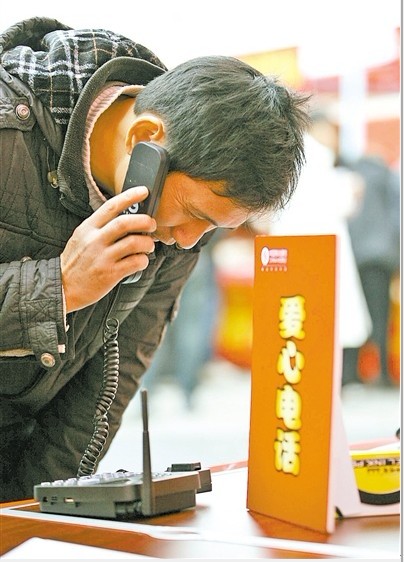 平安电话服务台前,任大爷给江苏老家打了个电话,告诉家里人自己买到了当天下午2时的车票。任大爷说,听说今年火车票很紧张,排队也买不到,家里人一直担心他回不了家,所以一买到票就先跟家里报个信。“长途电话很贵,以前我说下回家时间就挂了,今天看是免费的,就多讲了几句,”任大爷呵呵地笑说,“刚才我儿子跟我说,要去车站接我哩!”