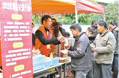 1月8日上午9时不到,温州火车站“春运关爱行动”热粥供应点的工作人员还在忙碌着准备工作,不少人就已在摊前等待。