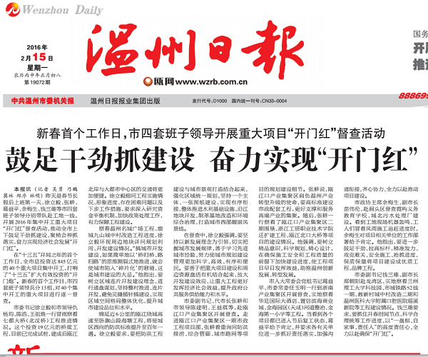 本报讯 (记者 吴勇 乃鹏 巽林 郑序 林明) 昨天是春节长假后上班第一天,徐立毅、张耕、葛益平、余梅生、钱三雄等市四套班子领导分别带队赴工地一线,开展2016年集中开工重大项目“开门红”督查活动,推动全市上下鼓足干劲抓建设,聚精会神抓落实,奋力实现经济社会发展“开门红”。