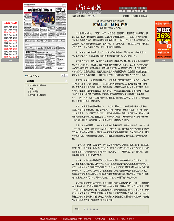近年来,文化产业发展受到了各级政府的高度重视。浙江省委将文化产业作为“十三五”发展的重要产业来抓;温州市委、市政府也将文化创意产业列入重点发展的十大新兴产业之一,并且出台了《温州市文化创意产业规划(2015-2020)》和配套的《2015-2017年三年行动计划》。过去几年,温州文化产业发展迅猛,文化产业竞争力上升至浙江全省第4位,2014年实现增加值202.45亿元。2015年首次集中举办的温州国际时尚文博会,在国内一炮打响,观展人数10.82万人次,展会成交额达2.53亿元,取得了良好的社会反响。