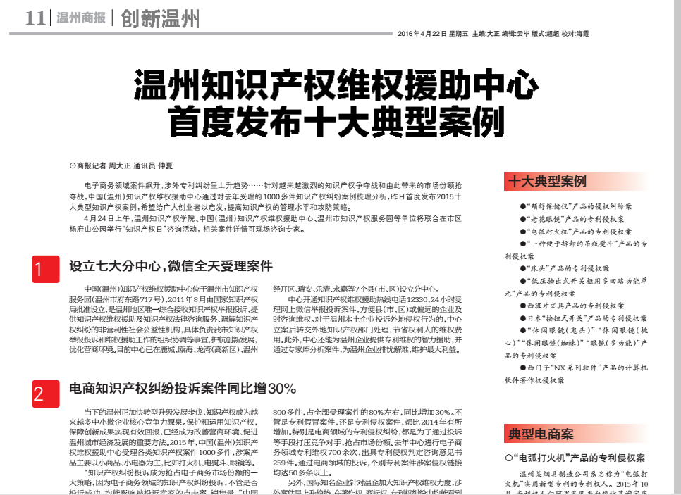 当下的温州正加快转型升级发展步伐,知识产权成为越来越多中小微企业核心竞争力源泉。保护和运用知识产权,保障创新成果实现有效回报,已经成为改善营商环境、促进温州城市经济发展的重要方法。2015年,中国(温州)知识产权维权援助中心受理各类知识产权案件1000多件,涉案产品主要以小商品、小电器为主,比如打火机、电熨斗、眼镜等。