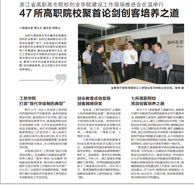 工贸学院目前为教育部高等学校创业教育指导委员会副主任单位,全国高等学校创业教育研究与实践先进单位,其创新创业教育影响不断扩大,受到国家、省市多位领导高度评价。今年2月,浙江省省长李强调研工贸学院,对学院创新创业教育给予了高度肯定和评价。2016年3月,教育部副部长郝平调研时指出:创新创业教育在工贸学院发生了质的飞跃。