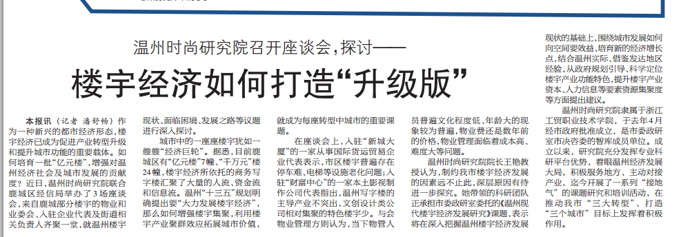 本报讯 (记者 潘舒畅) 作为一种新兴的都市经济形态,楼宇经济已成为促进产业转型升级和提升城市功能的重要载体。如何培育一批“亿元楼”,增强对温州经济社会及城市发展的贡献度?近日,温州时尚研究院联合鹿城区经信局举办了3场座谈会,来自鹿城部分楼宇的物业和业委会、入驻企业代表及街道相关负责人齐聚一堂,就温州楼宇现状、面临困境、发展之路等议题进行深入探讨。