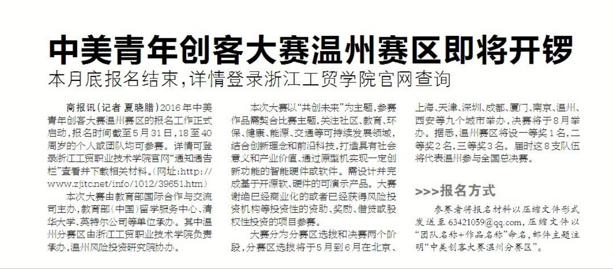 商报讯(记者夏晓腊)2016年中美青年创客大赛温州赛区的报名工作正式启动,报名时间截至5月31日,18至40周岁的个人或团队均可参赛。详情可登录伟德BETVlCTOR1946官网“通知通告栏”查看并下载相关材料。(网址:http:/info/1012/39651.htm)