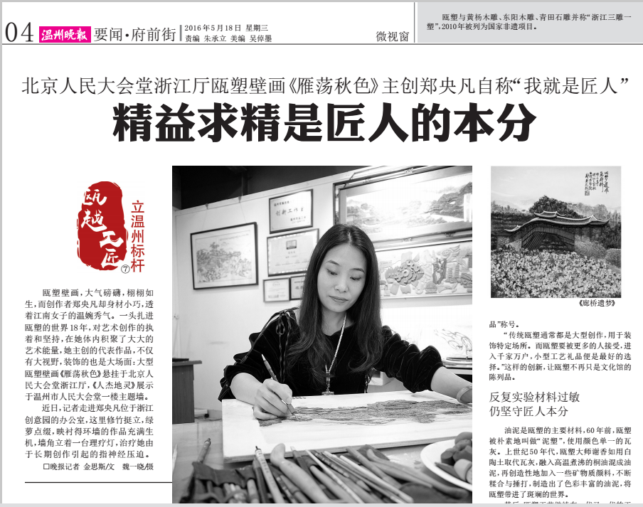瓯塑壁画,大气磅礴,栩栩如生,而创作者郑央凡却身材小巧,透着江南女子的温婉秀气。一头扎进瓯塑的世界18年,对艺术创作的执着和坚持,在她体内积聚了大大的艺术能量,她主创的代表作品,不仅有大视野,装饰的也是大场面:大型瓯塑壁画《雁荡秋色》悬挂于北京人民大会堂浙江厅,《人杰地灵》展示于温州市人民大会堂一楼主题墙。