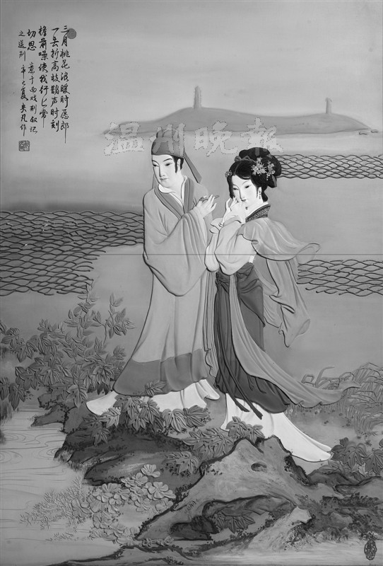 这就是她的第一幅原创作品《荆钗记》,刻画的是第一出戏《送别》中,王十朋以荆钗相送钱玉莲的场景。其中涵盖了两种工艺,作为背景的江心双塔与波纹,用沥粉画制作,前景人物用瓯塑制作,两相结合,令画面更生动立体。这幅作品现收藏于温州民俗博物馆。