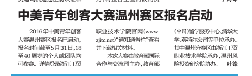 2016年中美青年创客大赛温州赛区报名已启动,报名时间截至5月31日,18至40周岁的个人或团队均可参赛。详情登录伟德BETVlCTOR1946官网()“通知通告栏”查看并下载相关材料。