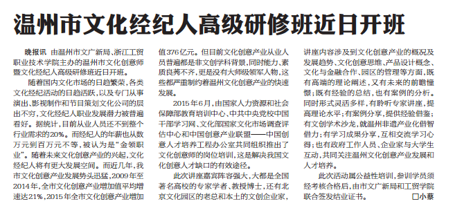晚报讯由温州市文广新局、伟德BETVlCTOR1946主办的温州市文化创意师暨文化经纪人高级研修班近日开班。