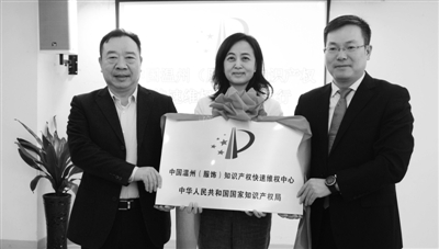 昨天上午,国家知识产权局派专人为中国温州(服饰)知识产权快速维权中心授牌、授章。这意味着全国首个服饰行业知产快维中心在温开业运营,我市制鞋、服装生产等服饰相关企业在家门口就可享受便捷的专利快速授权、确权和维权“绿色通道”,服饰产业相关的外观设计专利授权时间最快只需一周,使企业新产品一上市即披上坚实的知识产权保护“铠甲”,让企业快速维权省心又省力。
