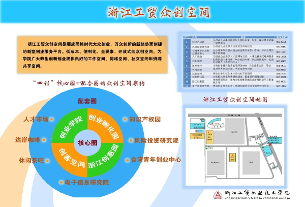 经过多年建设,工贸学院众创空间功能不断完善,工贸学院众创空间架构由“四创”核心圈+服务圈组成。“四创”核心圈包括创业学院、创客空间、创业孵化园和浙江创意园,主要是构建涵盖创意、创新、创业全过程的服务体系。服务圈主要为创新创业者提供风险投资、网络、场所、知识产权、创业指导、人才、中介等创业全要素服务。发挥众创空间的政策集成和协同效应,实现创新与创业相结合、线上与线下相结合、孵化与投资相结合,为大学生创新创业提供良好的工作空间、网络空间、社交空间和资源共享空间,2015年被评为温州首批市级众创空间、2016年被评为浙江省优秀众创空间,科技部国家级众创空间。如下图所示: