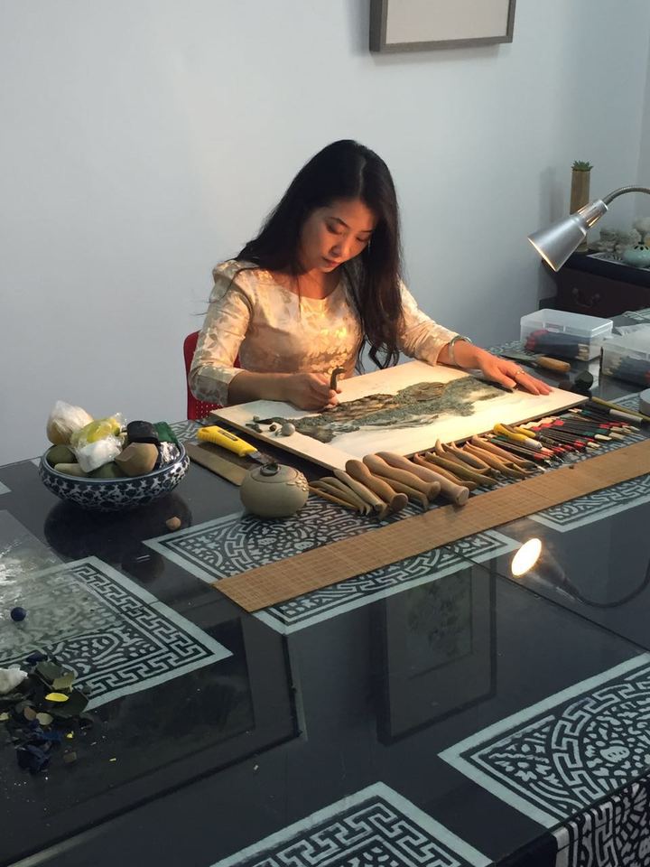 见到郑老师时,她带的两个徒弟正好在准备塑形时要用的油泥。油泥是将高岭土加入到煮沸的熟桐油中,再加入矿物质和植物质颜料染色,最后放入捣臼中捣制而成。拿来创作之前,油泥还必须经过揉、压。男徒弟翻过手掌给我看,叹道:“手掌很疼。”女徒弟则直言:“揉泥的时候,痛苦死了。”