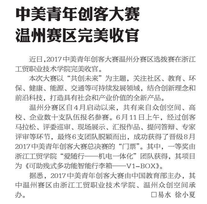 近日,2017中美青年创客大赛温州分赛区选拨赛在伟德BETVlCTOR1946完美收官。
