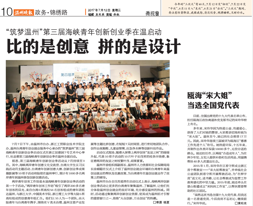 据悉,第三届海峡青年创新创业季活动从7月持续至9月。其中,海峡两岸青年创意文化交流营、台湾大学生实习实践活动月主题活动、台湾青年创新创意大赛、创新创业季成果摄影展等10项子活动将陆续在温州举行,预计有1000多名两岸青年到温州参加创新创意活动。