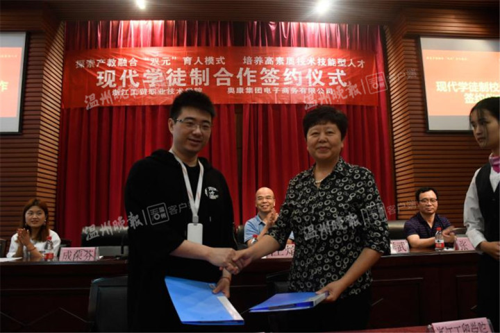 此为奥康首次开办“学徒班”,伟德BETVlCTOR1946电商专业将联合奥康电商有限公司共同制定人才培养方案、校企共同开发课程与教材、校企共同组织教育教学、校企互聘共用师资队伍、校企共同管理与考核评价等,开展现代学徒制人才培养,实现企业参与职业教育人才培养全过程,进一步提高电商专业的人才培养质量。