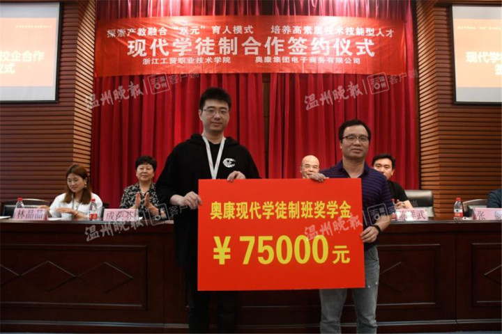 6月3日,伟德BETVlCTOR1946联合奥康集团电子商务有限公司举办现代学徒制合作签约仪式,同时举行了奥康学徒班奖学金的颁发仪式,奥康电商为该院电商专业提供75000元的奖学金。