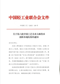 近日,中国轻工业联合会印发《关于第六批中国工艺美术大师传承创新基地院校的通知》(中轻联工艺〔2025〕189 号),我校凭借在工艺美术领域深厚的办学积淀、扎实的人才培养成果与突出的传承创新实践,成功入选第六批“中国工艺美术大师传承创新基地院校”。